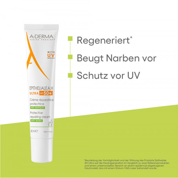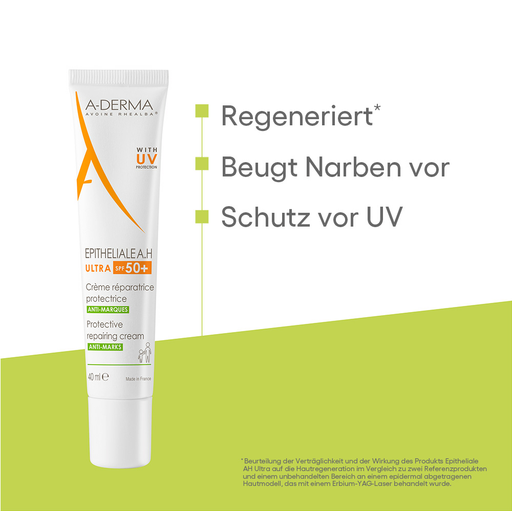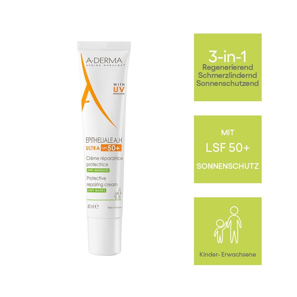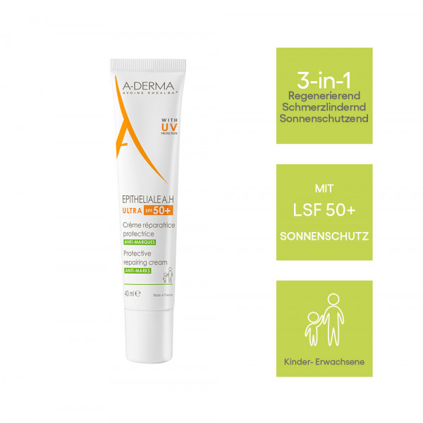 Die Epithiale A.H. Ultra mit LSF 50+ Regeneriert die Haut effektiv mit nur vier optimierten Filtern in minimaler Konzentration. Weiterhin werden Narbenbildung und Pigmentflecken reduziert. Wunden werden extrem schnell verschlossen ohne Fleckenbildung. Die Creme bringt echten Alltagskomfort und trägt zum Wohlbefinden bei dank ihrer starken schmerzreduzierenden Wirkung. Die Creme ist Leicht aufzutragen, dank einer flüssigen und glatten Textur (Nicht komedogen).