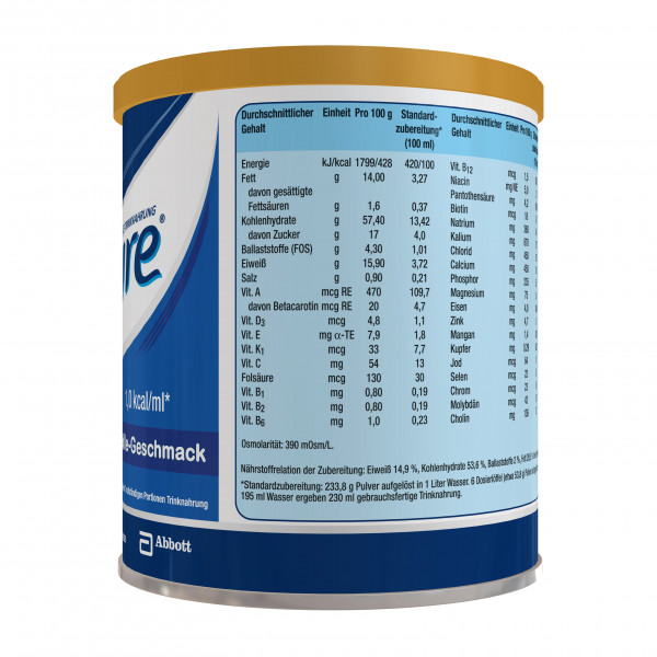 • Hier stellen wir Ihnen eines der weltweit beliebtesten Trinknahrungspulver vor: Feiner Vanillegeschmack, vollbilanziert mit einer guten Löslichkeit. Es gibt für dieses Produkt sogar ein Kochbuch, welches viele überaschende Zubereitungsmethoden beschreibt. Auch mit diesem Pulver können Sie die benötige Energiemenge individuell anrühren.
