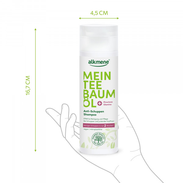 Das alkmene MEIN TEEBAUMÖL Anti-Schuppen Shampoo mit der einzigartigen Wirkkombination aus Teebaumöl und Piroctone Olamine lindert Juckreiz, reduziert nachweislich Schuppen und beugt deren Neubildung vor. Sie beruhigt und wirkt trockener, juckender Kopfhaut entgegen. Für geschmeidiges Haar und gesunde Kopfhaut. Hautverträglichkeit dermatologisch bestätigt.