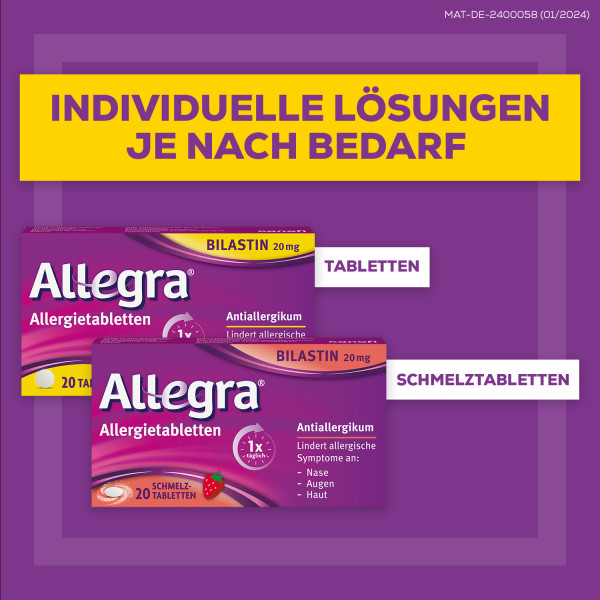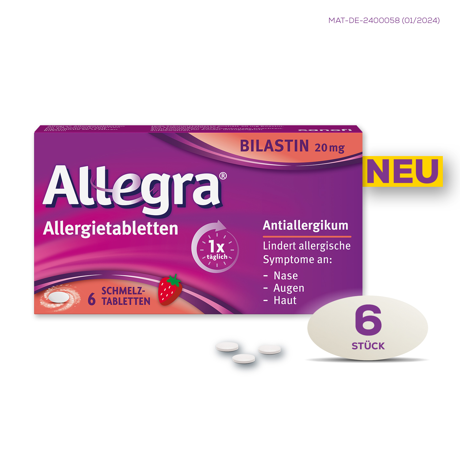 Allegra® Schmelztabletten lindern allergische Symptome an Nase, Augen oder Haut, die im Zusammenhang z.B. mit Heuschnupfen, Hausstaub- und Tierhaar-Allergie sowie