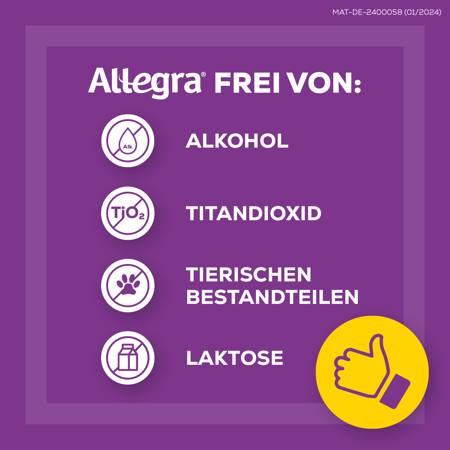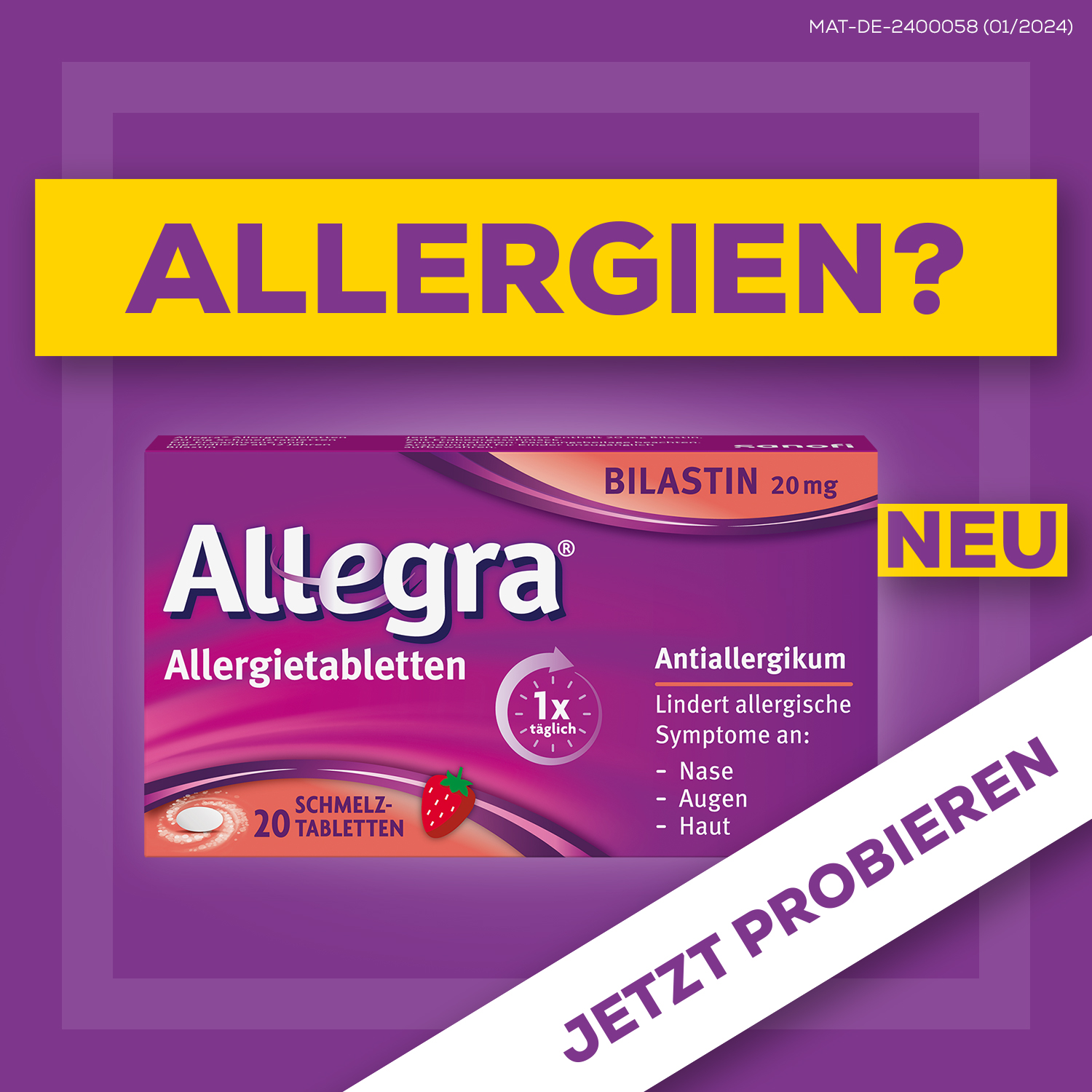 Allegra® Schmelztabletten lindern allergische Symptome an Nase, Augen oder Haut, die im Zusammenhang z.B. mit Heuschnupfen, Hausstaub- und Tierhaar-Allergie sowie