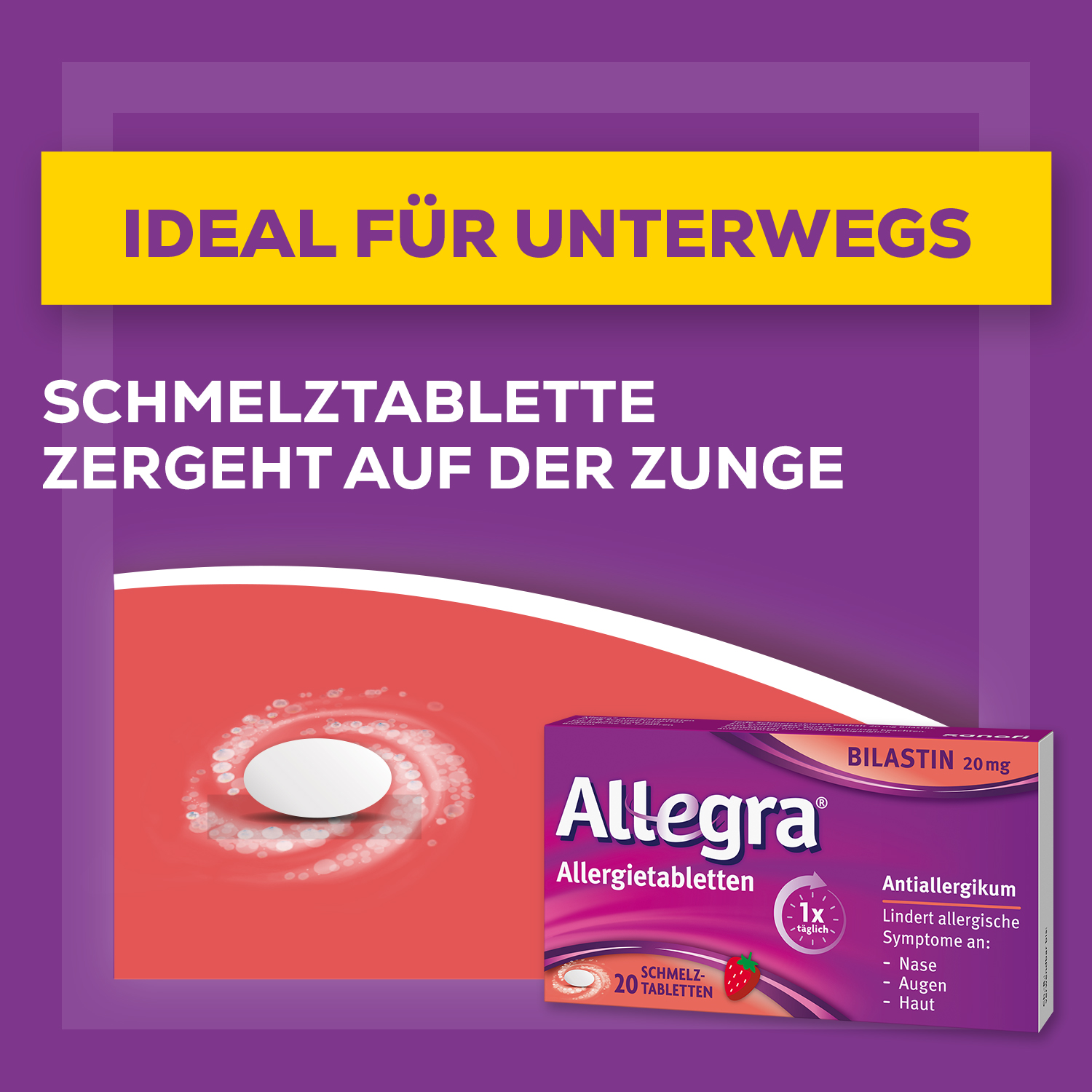 IDEALE EINNAHME – AUCH UNTERWEGS: Allegra® Schmelztabletten mit Erdbeergeschmack zergehen ohne Wasser auf der Zunge und kontrollieren Allergiesymptome wirksam für 24 h – mit nur 1 Tablette am Tag. Die Einnahme erfolgt idealerweise eine Stunde vor oder zwei Stunden nach dem Frühstück.