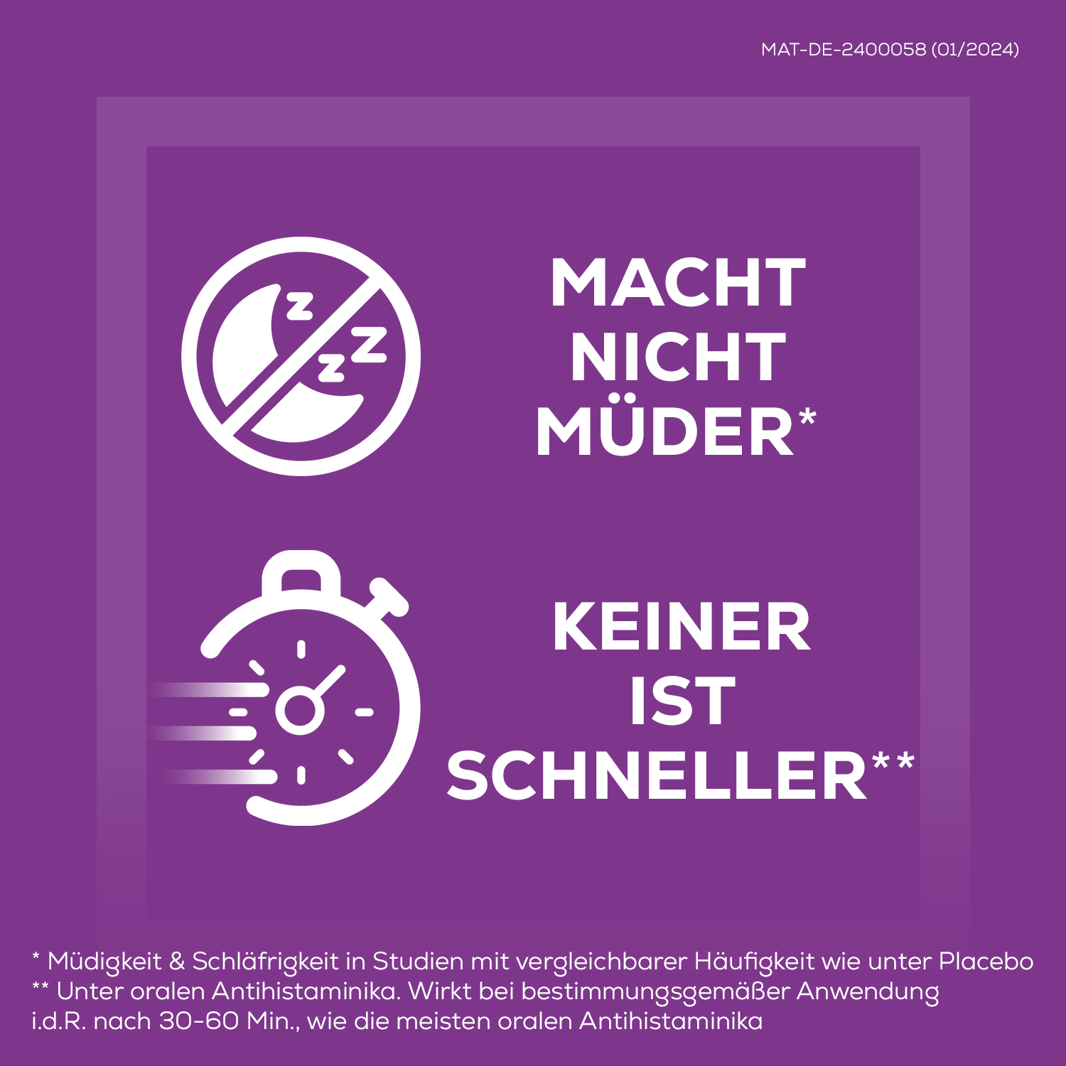 - MACHT NICHT MÜDER* als durch die Allergie bedingte Müdigkeit. Der Wirkstoff Bilastin dringt nicht ins Schlafzentrum vor, wo Müdigkeit entsteht.