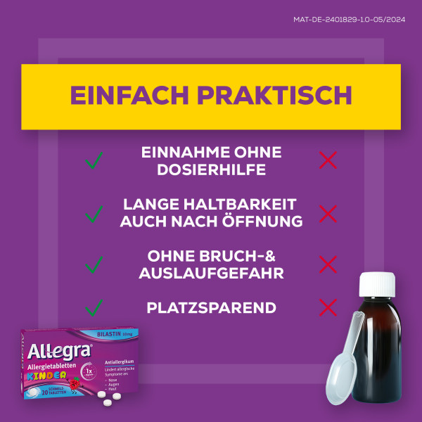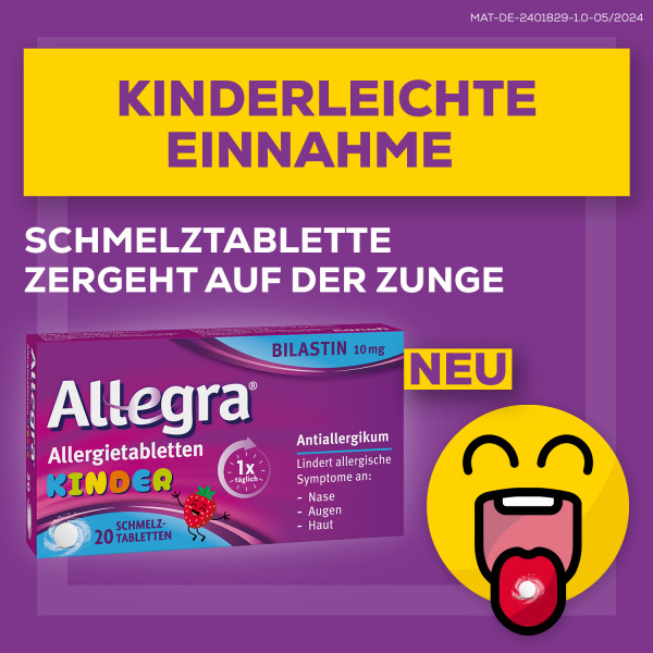 · KINDERLEICHTE EINNAHME: Allegra® Schmelztabletten für Kinder zergehen auf der Zunge und können ohne Wasser eingenommen werden. Sie kontrollieren Allergiesymptome für 24 Stunden bei nur 1x täglicher Einnahme.