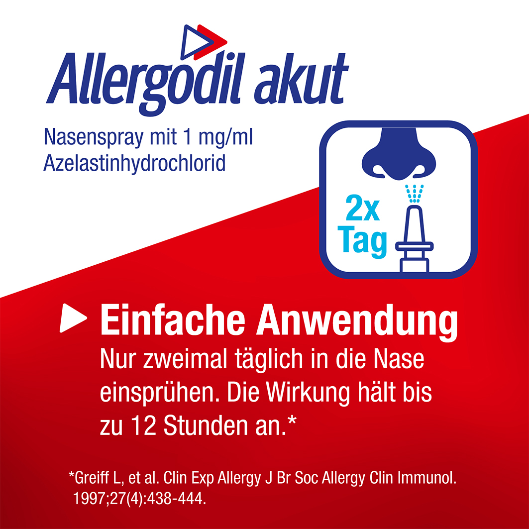 Das Allergodil akut Nasenspray mit dem Wirkstoff Azelastinhydrochlorid kann bei diesen Allergiebeschwerden schnelle und langanhaltende Linderung verschaffen. Der Wirkstoff hemmt das bei einer Allergie vermehrt ausgeschütteten Histamin und andere entzündlich wirkende Stoffe, die bei einer Allergie vermehrt freigesetzt werden. Dadurch werden unter anderem übermäßige Nasensekretion, quälender Niesreiz und Schwellungen der Nasenschleimhaut gehemmt. Da Allergodil akut Nasenspray direkt auf die Nasenschleimhaut einwirkt, werden trotz der geringen Wirkstoffdosierung die allergischen Beschwerden an der Nase schnell und wirksam vermindert.