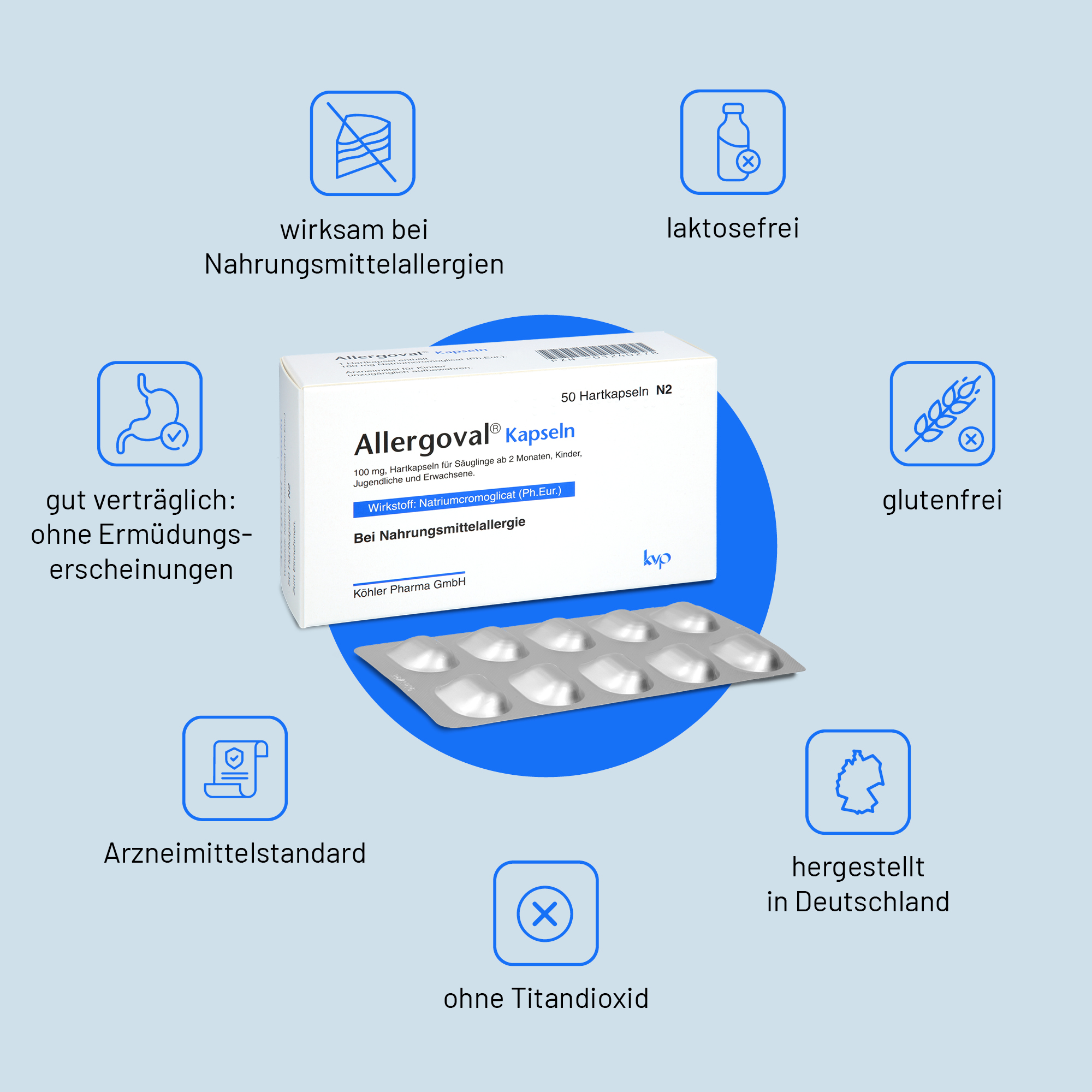 Erwachsene und Jugendliche ab dem 15. Lebensjahr nehmen viermal täglich 2 Kapseln Allergoval (entsprechend insgesamt 800 mg Natriumcromoglicat) ein. Kinder im Alter von zwei bis vierzehn Jahren erhalten viermal täglich eine Kapsel Allergoval (entsprechend insgesamt 400 mg Natriumcromoglicat). Bei Säuglingen und Kleinkindern zwischen zwei Monaten und zwei Jahren beträgt die Tagesdosis 20 - 40 mg/kg Körpergewicht. Sie sollte möglichst in gleich großen Einzeldosen vor jeder Mahlzeit verabreicht werden. Hierzu ist es gegebenenfalls erforderlich, den Inhalt einer Kapsel auf mehrere Gaben zu verteilen. Sofern erforderlich, kann die Dosis bei Erwachsenen auf viermal täglich 5 Kapseln Allergoval, bei Kindern im Alter von zwei bis vierzehn Jahren auf maximal viermal täglich 2 Kapseln Allergoval (entsprechend insgesamt 800 mg Natriumcromoglicat) erhöht werden. Eine Tagesdosis von 40 mg/kg Körpergewicht sollte jedoch nicht überschritten werden.
