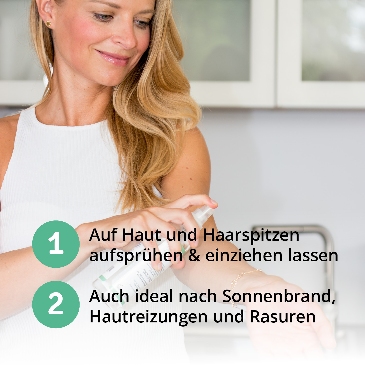 Das praktische Aloe Vera Spray mehrmals täglich auf Haut und Haare aufsprühen.