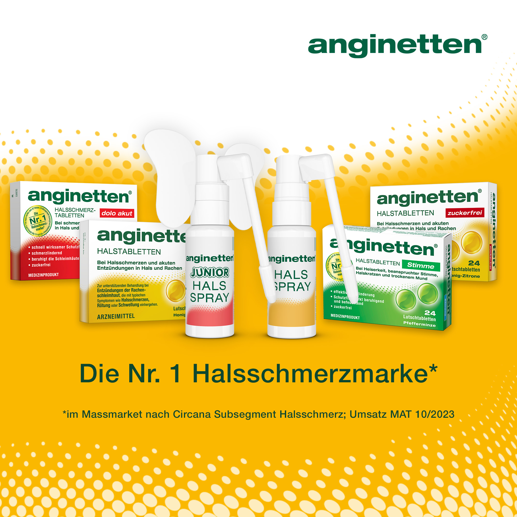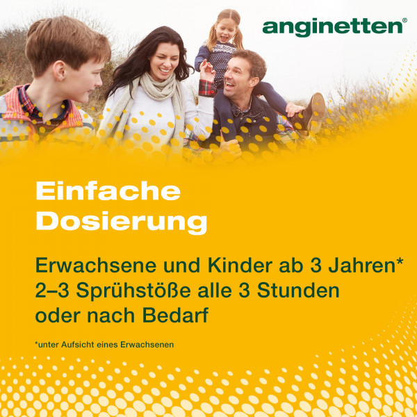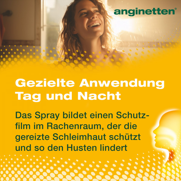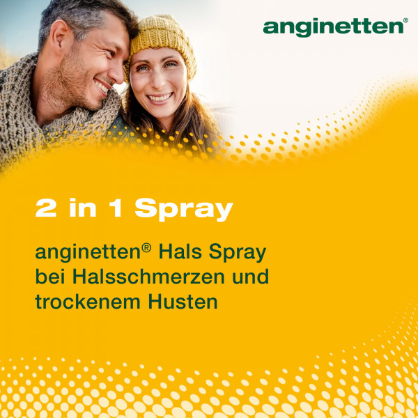 Das anginetten® Hals Spray 2 in 1 ist ein Medizinprodukt mit einer Honig-Rezeptur zur Beruhigung von Husten und zur Linderung von Halschmersymptomen. Das Spray bildet einen Schutzfilm im Rachenraum, der die gereizte Schleimhaut schützt und den Husten lindert. Das anginetten® Hals Spray 2 in 1 kann von Erwachsenen und Kindern ab 3 Jahren verwendet werden.