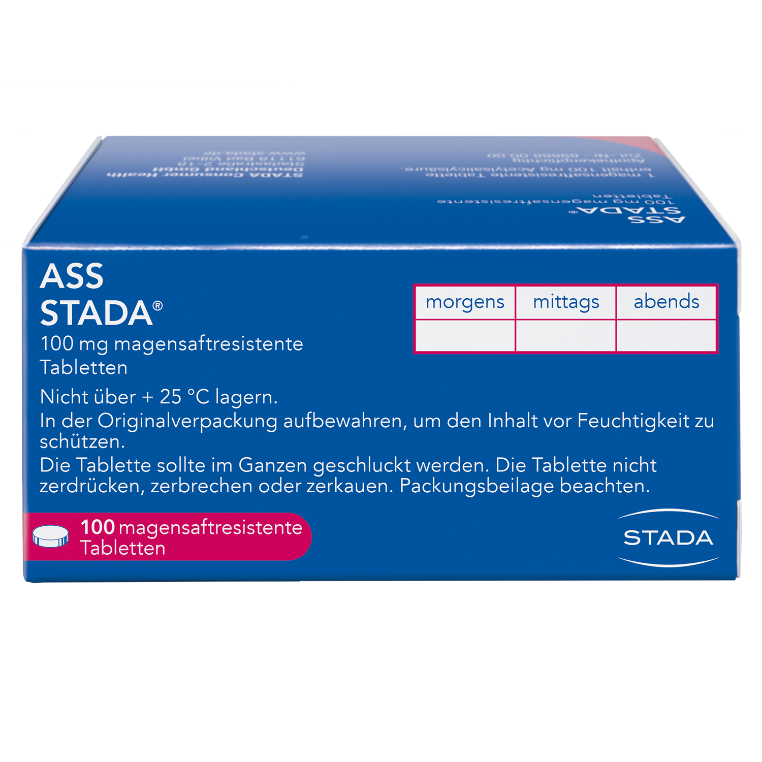 ASS STADA® 100 mg magensaftresistente Tabletten mit dem Wirkstoff Acetylsalicylsäure · Behandlung als Blutplättchenaggregationshemmer · Tabletten enthalten 100 mg Acetylsalicylsäure So wirken ASS STADA® 100 mg magensaftresistente Tabletten Die ASS STADA® 100 mg magensaftresistenten Tabletten enthalten Acetylsalicylsäure, welche als Wirkstoff gegenüber Thrombozyten aggregationshemmend wirkt. Als „Thrombozyten“ werden sehr kleine Zellen im Blut bezeichnet, die das Blut zum Gerinnen bringen können. Solche „Blutgerinnsel“ können bei Herzerkrankungen oder bei Patienten mit Schlaganfall in der Vorgeschichte gravierende Folgen haben.