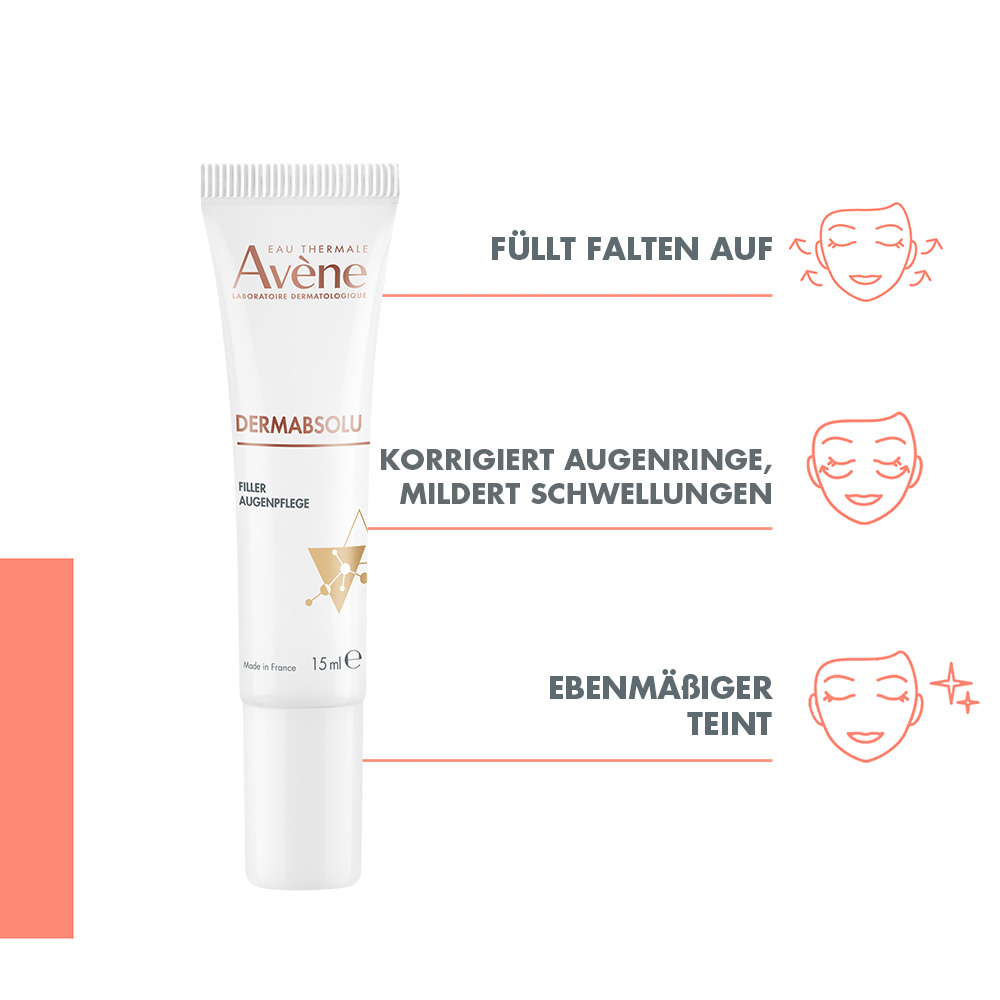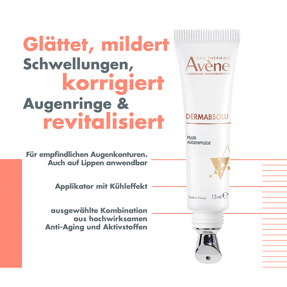 Die Eau Thermale Avène DERMABSOLU Filler Augenpflege füllt Falten auf, korrigiert Augenringe und mindert Schwellungen. Zudem hat es einen abschwellenden und kühlenden Effekt.