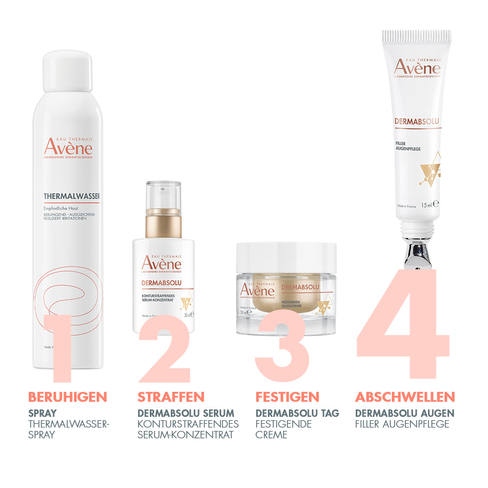 Avène DERMABSOLU wirkt 3 klinischen Zeichen der Hautalterung entgegen: Die Gesichtskonturen werden gestrafft, die Haut wird intensiv genährt, und der Teint ist strahlend.
