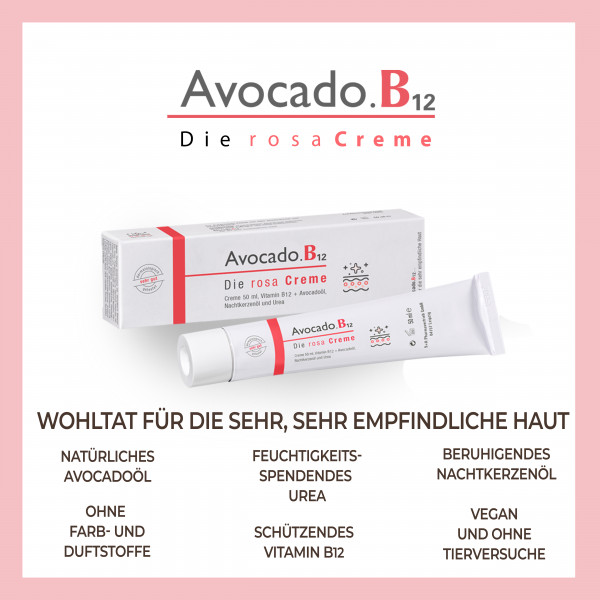 Avocado.B12 – Die rosa Creme ist eine besonders sanfte Hautpfl ege, die mit Avocadoöl, Nachtkerzenöl und Vitamin B12 in einer einzigartigen Galenik die Hautregeneration fördert, Feuchtigkeitsverlust vermindert