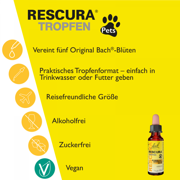 Bach RESCURA® Pets unterstützt (Haus-)tiere bei kleinen und großen Herausforderungen. Ob Gewitter oder Feuerwerk, Tierarztbesuch, Autofahrt oder Trennungsangst. Sie erkennen schnell, wenn sich Ihr Haustier überfordert fühlt. Dann können schon ein paar Bach RESCURA® Pets Tropfen dabei helfen, verschiedene emotionale Wogen zu glätten. Vor bereits über 90 Jahren entwickelte Edward Bach das System der 38 Bachblüten. Diese werden bis heute in ihrer ursprünglichen Form als die Original Bach®-Blüten weitergeführt. Die Bach RESCURA® Tropfen enthalten die Original Bach®-Blütenmischung - Edward Bach's berühmte Kombination aus 5 Bachblüten Tropfen. Natürlich und ohne Nebenwirkungen. Keine chemischen Zusätze. Einfach anzuwenden. Alkoholfrei. Laktosefrei.