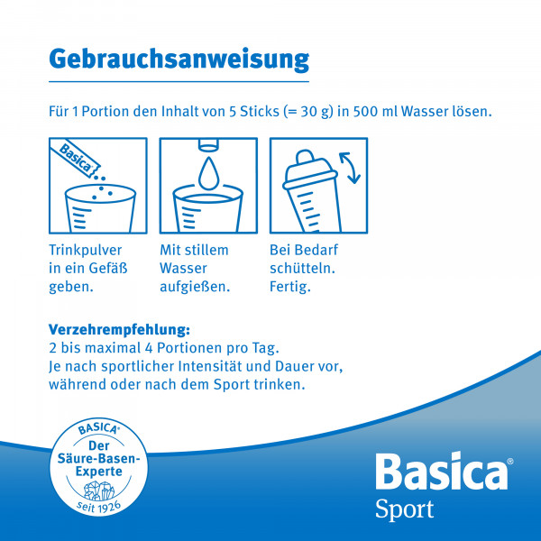 Pro Portion 30 g (5 Messlöffel bzw. 5 Sticks) in 500 ml Wasser auflösen. 2 bis maximal 4 Portionen pro Tag. Je nach sportlicher Intensität und Dauer vor, während oder nach dem Sport trinken.