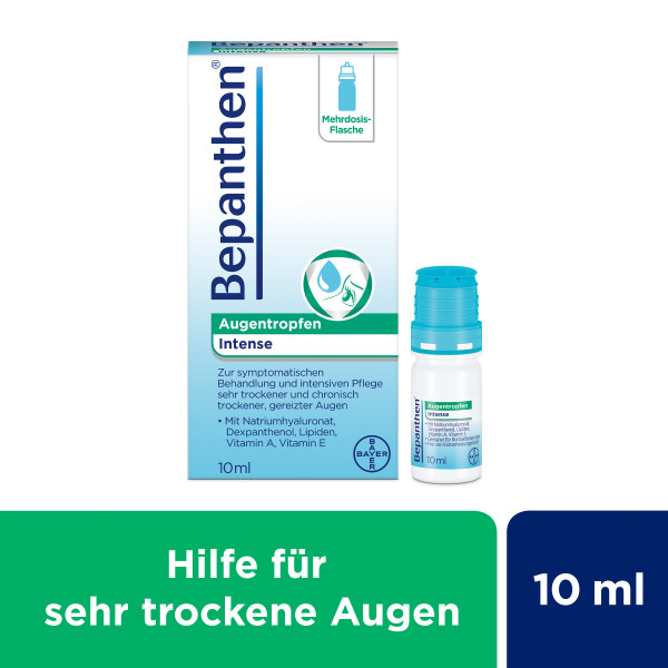 Die neuen Bepanthen® Augentropfen Intense bieten eine wirksame Hilfe bei sehr trockenen Augen oder chronisch trockenen Augen. Durch die enthaltenen Inhaltsstoffe und den besonderen Lipid-Schutzschild-Komplex schützen Bepanthen® Augentropfen Intense vor der vorzeitigen Verdunstung des Tränenfilms und sorgen für eine langanhaltende Befeuchtung. Damit beruhigen Bepanthen® Augentropfen Intense sehr trockene Augen sowie chronisch trockene Augen und lindern die Beschwerden.