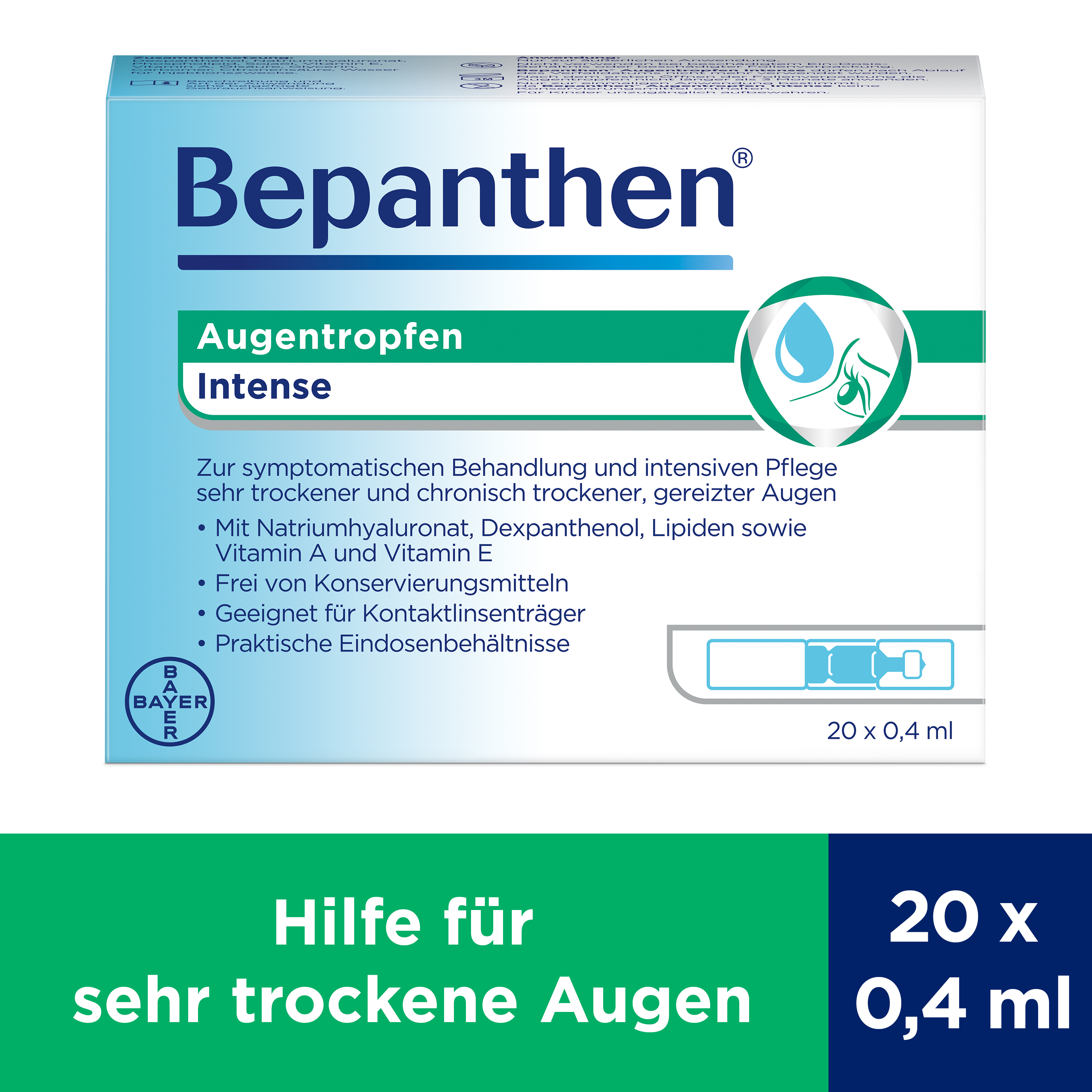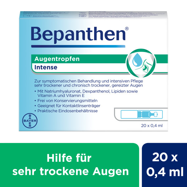 Die neuen Bepanthen® Augentropfen Intense bieten eine wirksame Hilfe bei sehr trockenen Augen oder chronisch trockenen Augen. Durch die enthaltenen Inhaltsstoffe und den besonderen Lipid-Schutzschild-Komplex schützen Bepanthen® Augentropfen Intense vor der vorzeitigen Verdunstung des Tränenfilms und sorgen für eine langanhaltende Befeuchtung. Damit beruhigen Bepanthen® Augentropfen Intense sehr trockene Augen sowie chronisch trockene Augen und lindern die Beschwerden.