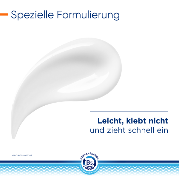Der B5-Regenerations-Komplex unterstützt die Regeneration der Haut – von innen nach außen. Dabei fördert Dexpanthenol in tieferen Hautschichten der Epidermis die natürliche Zellregeneration. Das enthaltene Glycerin spendet sofortige und lang anhaltende Feuchtigkeit. Niacinamid (Vitamin B3) beruhigt juckende, trockene Haut und natürliche Lipide wie Sheabutter und Arganöl ergänzen fehlende Hautlipide. Das physiologische Lipid unterstützt zusätzlich die Anordnung der Doppellipidschicht.