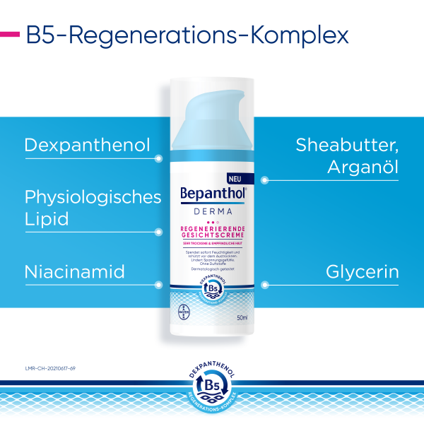 Die Wirksamkeit und Verträglichkeit der Bepanthol® DERMA Regenerierende Gesichtscreme ist klinisch geprüft. Die Creme ist nicht-komedogen. 90 % der Inhaltsstoffe sind natürlichen Ursprungs.