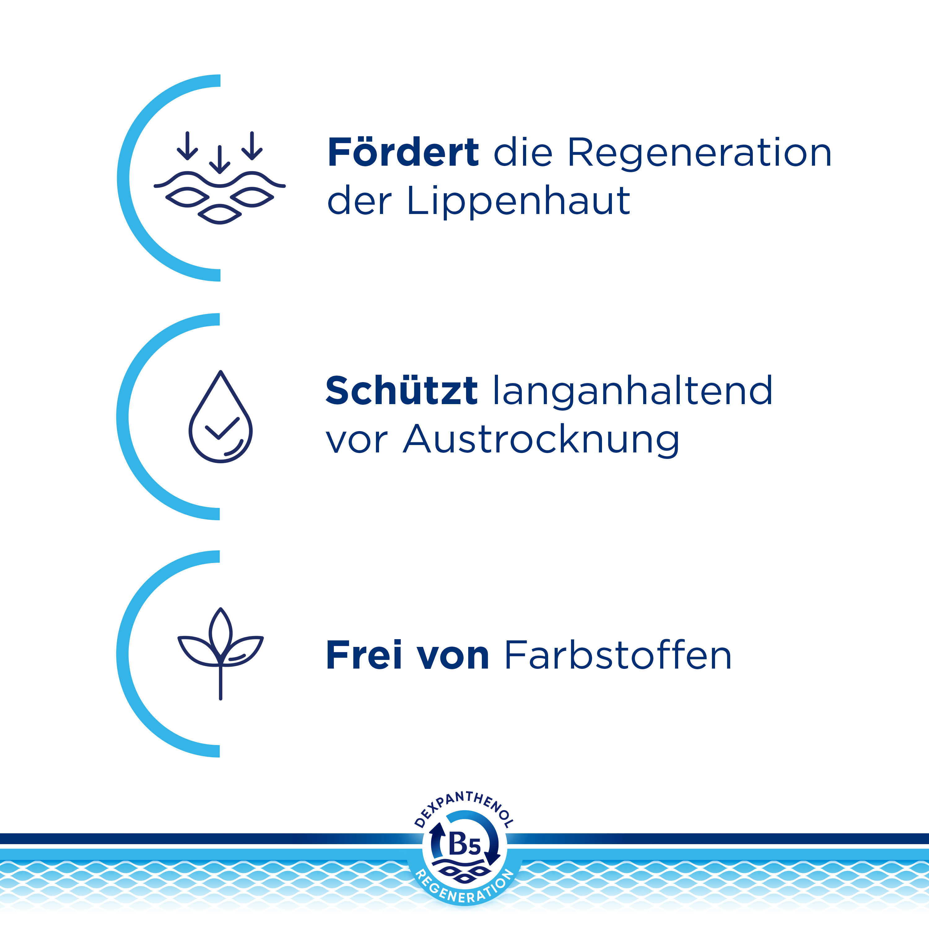 Dexpanthenol stellt den Lippen Feuchtigkeit zur Verfügung und unterstützt die Haut gleichzeitig bei der Produktion neuer Zellen.