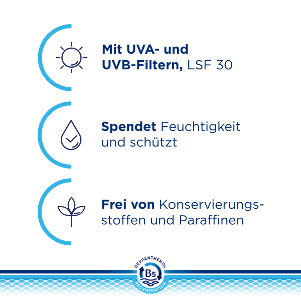 Der Bepanthol® Pflegende Lipstick macht trockene Lippen wieder geschmeidig: Mit pflegenden Lipiden und Bienenwachs sorgt er für Feuchtigkeit und schützt die Lippen gleichzeitig vor weiterem Austrocknen. Der Pflegestift für jeden Tag zieht gut ein und schützt zudem mit Lichtschutzfaktor 30 vor schädigender UV-Strahlung. Er ist frei von Konservierungsstoffen und Paraffinen.