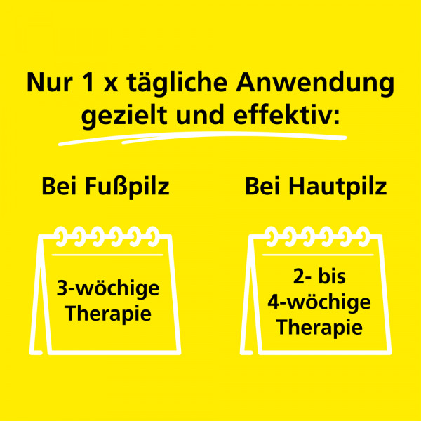 Die Anwendungsdauer richtet sich nach der Art der Beschwerden und/oder dem Verlauf der Erkrankung. Behandlungsdauer: bei Fußpilz und bei Pilzinfektionen zwischen den Zehen oder Fingern 3 Wochen, bei Pilzbefall der Haut und bei Pilzbefalll in Hautfalten mit Fadenpilzen 2-3 Wochen, bei Hautflechte durch Kleienpilz und Zwergflechte 2 Wochen, bei Pilzbefall der Haut mit Hefepilzen 2-4 Wochen.