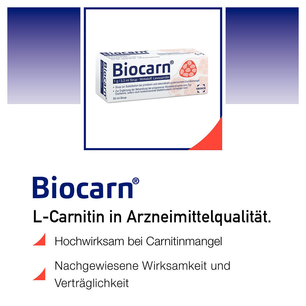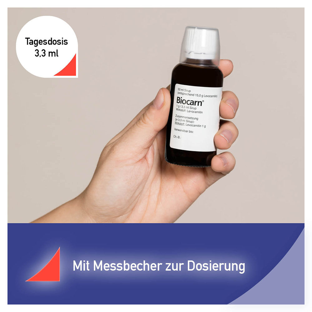 Gut zu wissen: Die Dosierung von Carnitin in Nahrungsergänzungsmitteln ist oftmals nicht ausreichend, um einen Carnitinmangel auszugleichen. Biocarn® hingegen ist hochdosiert und enthält 303 mg Levocarnitin pro ml Sirup. Aufgrund seiner nachgewiesenen Wirksamkeit und Verträglichkeit ist Biocarn® als Arzneimittel zugelassen und liefert den Wirkstoff somit in höchster Arzneimittelqualität.