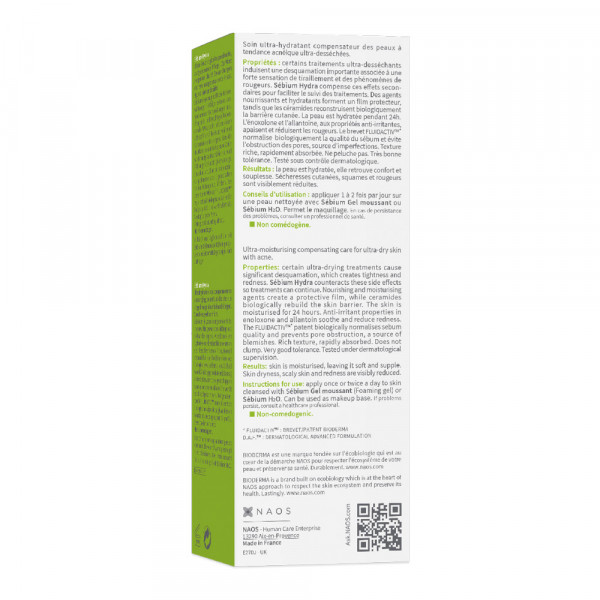 Besonders während einer oralen Aknetherapie ist die Haut meist sehr gereizt und trocken. Sébium Hydra unterstützt die stark strapaziert Haut mit patentierten Wirkprinzipien und ihrer feuchtigkeitsspendenden Wirkung.