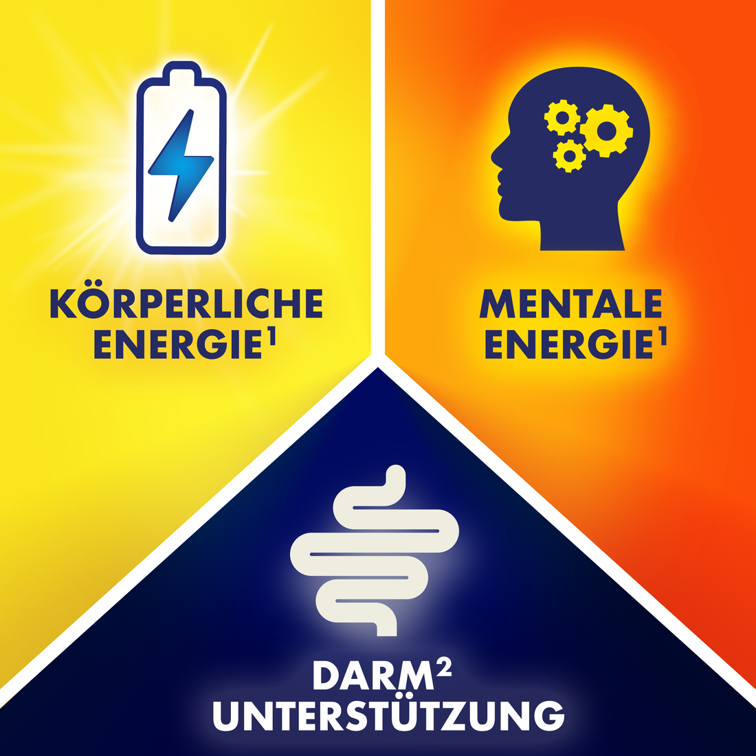 ENERGIE AUS DEM BAUCH HERAUS: Vitamin B2, Biotin zur Unterstützung des Darms2; B12, B6, C zur Freisetzung körperlicher und mentaler Energie1, Eisen, Zink zur Unterstützung der kognitiven Funktionen.
