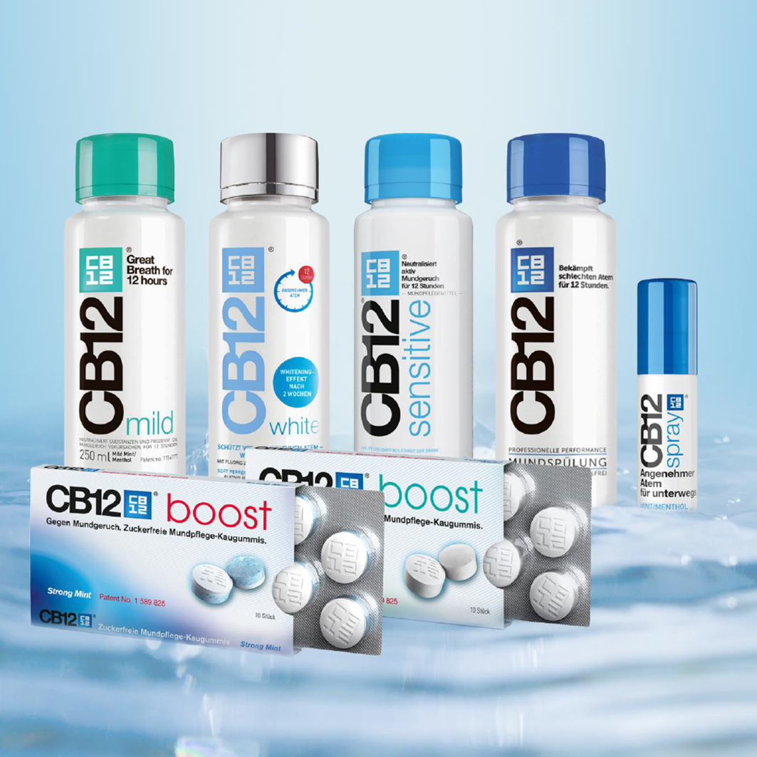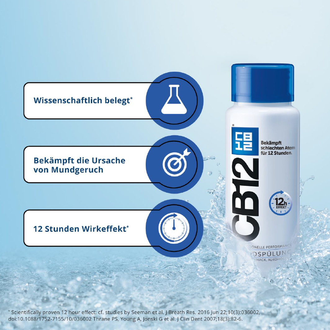 Das Produkt enthält 0,3% Zink, 0,025% Chlorhexidin und 0,05% Natriumfluorid. CB12 schmeckt frisch nach Minze und Menthol.