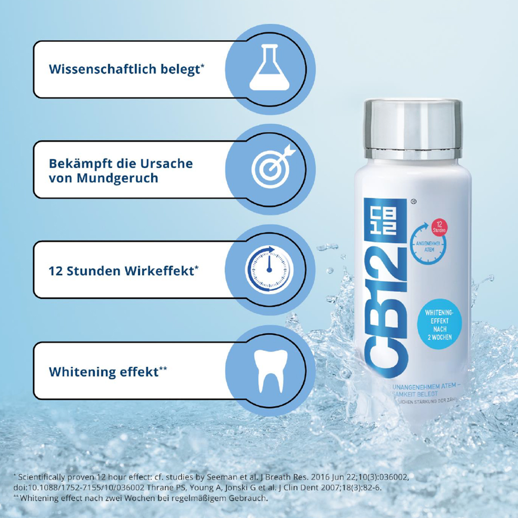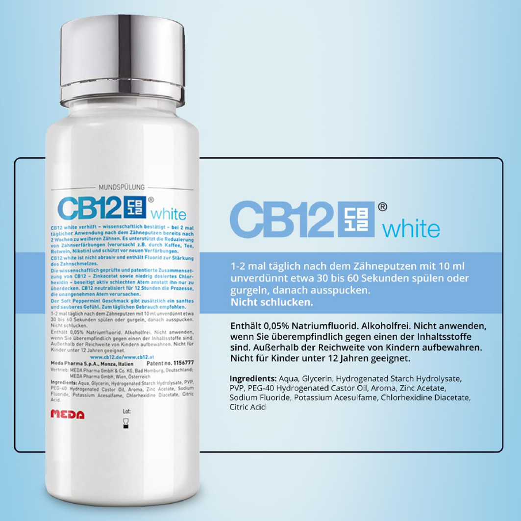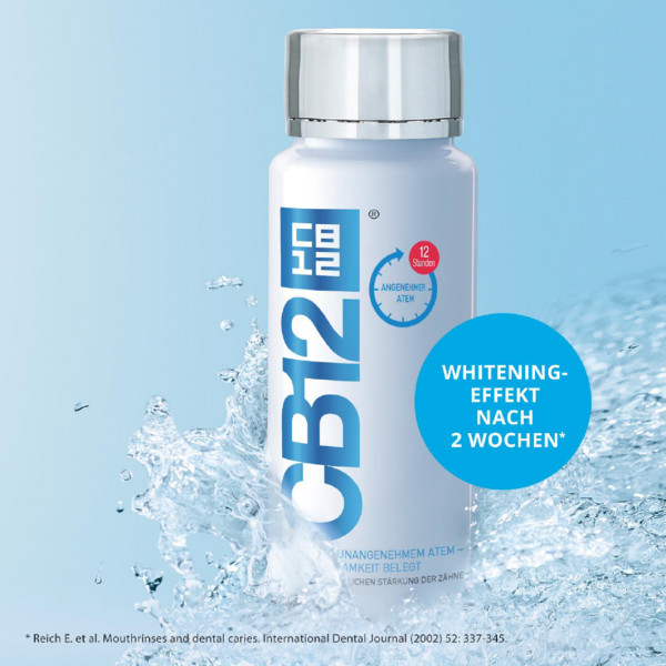 CB12 white verhilft - wissenschaftlich bestätigt - bei 2 mal täglicher Anwendung nach dem Zähneputzen bereits nach 2 Wochen zu weißeren Zähnen. Es unterstützt die Reduzierung von Zahnverfärbungen (verursacht z.B. durch Kaffee, Tee, Rotwein, Nikotin) und schützt vor neuen Verfärbungen. CB12 white ist nicht abrasiv und enthält Fluorid zur Stärkung des Zahnschmelzes.