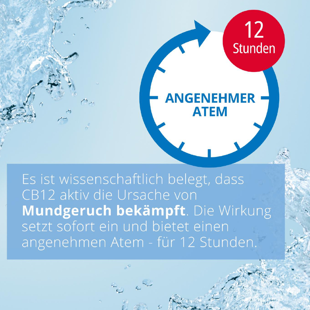 Die wissenschaftlich geprüfte und patentierte Zusammensetzung von CB12 - Zinkacetat sowie niedrig dosiertes Chlorhexidin - beseitigt aktiv schlechten Atem anstatt ihn nur zu überdecken. CB12 neutralisiert für 12 Stunden die Prozesse, die unangenehmen Atem verursachen.