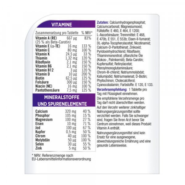 Mikronährstoffe pro Tablette % NRV[*] Vitamin A (RE) (25% als Beta-Carotin) 667 µg 83 % Vitamin E (α-TE) 16 mg 133 % Vitamin C 80 mg 100 % Vitamin K 24,5 µg 33 % Thiamin 1,32 mg 120 % Riboflavin 2,1 mg 150 % Vitamin B6 2,1 mg 150 % Vitamin B12 3 µg 120 % Vitamin D 10 µg 200 % Biotin 62,5 µg 125 % Folsäure 300 µg 150 % Niacin (NE) 16 mg 100 % Pantothensäure 7,5 mg 125 % Calcium 320 mg 40 % Phosphor 105 mg 15 % Magnesium 100 mg 27 % Eisen 10 mg 71 % Jod 100 µg 67 % Kupfer 500 µg 50 % Mangan 2 mg 100 % Chrom 40 µg 100 % Molybdän 50 µg 100 % Selen 30 µg 55 % Zink 5 mg 50 % * NRV: Referenzmenge nach EU-Lebensmittelinformationsverordnung.