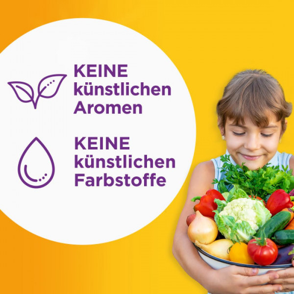 Dann kannst Du die Ernährung Deines Kindes ganz einfach und lecker mit den Vitamin Gummies von Centrum ergänzen und so eine gesunde Lebensweise unterstützen. Bereits ein Gummie trägt dazu bei, den täglichen Vitamin- und Mineralstoffbedarf Deines Kindes zu ergänzen. Nahrungsergänzung in lecker - Centrum Vitamin Gummies vereinen wichtige Vitamine und Mineralstoffe in Form von Gummibärchen als Alternative zu Tabletten. Die KIDS MULTI Vitamin Gummies beinhalten acht Vitamine und zwei essentielle Mineralstoffe, um das allgemeine Wohlbefinden von Kindern ab 4 Jahren zu fördern: Vitamin C, D und Zink tragen zu einer normalen Funktion des Immunsystems bei und unterstützen so gezielt die Abwehrkräfte. Vitamin D wird für ein gesundes Wachstum und eine gesunde Entwicklung der Knochen bei Kindern benötigt. Verzehrsempfehlung: 1 Weichgummi pro Tag. Weichgummi kauen, bis es sich auflöst, kann ohne Wasser eingenommen werden. Das Produkt kann eine Erstickungsgefahr darstellen und sollte unter Aufsicht von Erwachsenen vollständig gekaut werden. Die empfohlene tägliche Verzehrsmenge darf nicht überschritten werden. Nahrungsergänzungsmittel sind kein Ersatz für eine ausgewogene, abwechslungsreiche Ernährung und eine gesunde Lebensweise. Wenn Ihr Kind weitere Nahrungsergänzungsmittel einnimmt, lesen Sie die Produktangaben, weil sie den gleichen Nährstoff enthalten können. Außerhalb der Reichweite von Kindern lagern. Trocken und nicht über 25 °C lagern. Dose nach Gebrauch wieder verschließen. Nicht verwenden, wenn die Schutzfolie vor erstmaligem Gebrauch beschädigt ist.