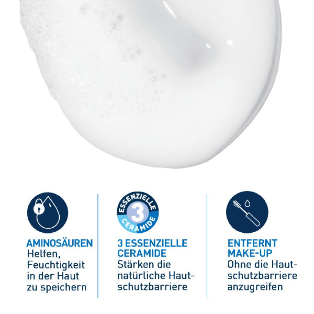 Die feuchtigkeitsspendende Creme-zu-Schaum Reinigung von CeraVe ist eine Reinigungscreme für normale bis trockene Haut. Die Creme reinigt sanft, entfernt Make-up und spendet Feuchtigkeit, ohne die Hautschutzbarriere anzugreifen. Die milde Gesichtsreinigung verwandelt sich beim Auftragen auf die Haut in einen weichen Schaum, der wirksam Verunreinigungen und Make-up entfernt – ohne der Haut die natürliche Feuchtigkeit zu entziehen. Die Formel ist mit Hyaluronsäure, Aminosäuren und Ceramiden angereichert. Diese Inhaltsstoffe versorgen trockene Haut intensiv mit Feuchtigkeit. Die CeraVe Gesichtsreinigung für empfindliche Haut wurde zusammen mit Dermatologen entwickelt.