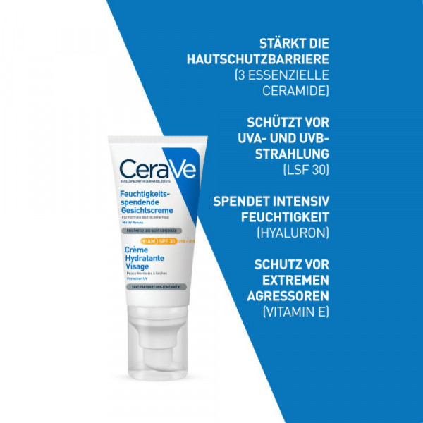 CeraVe Feuchtigkeitsspendende Gesichtscreme mit LSF 30 für normale bis trockene Haut Die Tagescreme mit Lichtschutz von CeraVe durchfeuchtet die Haut und versorgt sie mit wirksamen Inhaltsstoffen. Dank der patentierten Wirkstoff-Freisetzung (MVE) werden die Inhaltsstoffe über den Tag verteilt freigesetzt und hinterlassen ein langanhaltend seidiges und geschmeidiges Hautgefühl. Die sante Formel mit Hyaluron versorgt trockene Haut intensiv mit Feuchtigkeit, die Ceramide 1, 3 und 6-II stärken die natürliche Hautschutzbarriere und der LSF 30 schützt vor UVA- und UVB-Strahlen. Die nicht-komedogene Creme verzichtet auf Duftstoffe und Parabene.