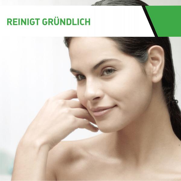 Sanft auf die zuvor angefeuchtete Haut einmassieren. Abspülen.
