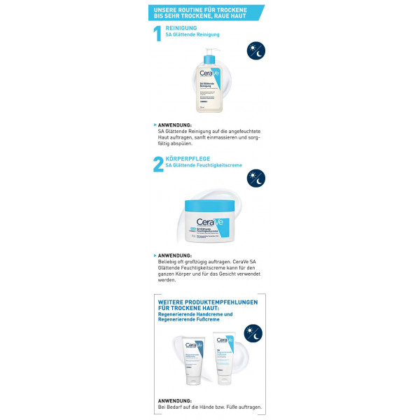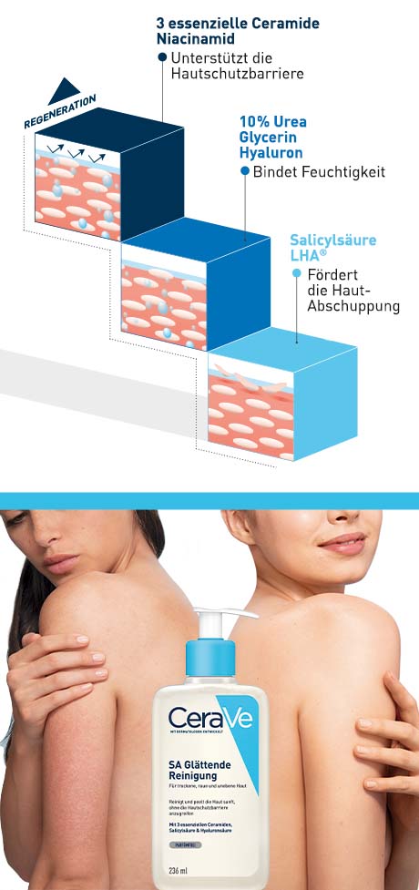Die SA Glättende Reinigung entfernt Schmutz & Talg, peelt die Haut sanft und glättet. Dank Inhaltsstoffe wie 3 essenziellen Ceramiden, Hyaluron- und Salicylsäure reinigt die Waschlotion Körper und Gesicht nicht nur, sondern pflegt die Haut langanhaltend. Salicylsäure sorgt mit seinem Peeling-Effekt dafür, dass die Haut glatter und geschmeidiger wird. Das Reinigungsgel stärkt mit 3 essenziellen Ceramiden die Hautschutzbarriere. Zusätzlich spendet Hyaluron intensiv und langanhaltend Feuchtigkeit. Mithilfe von Niacinamid beruhigt die SA Glättende Reinigung die Haut. Die Reinigung für den Körper und das Gesicht wurde für trockene, raue oder unebene Haut entwickelt.