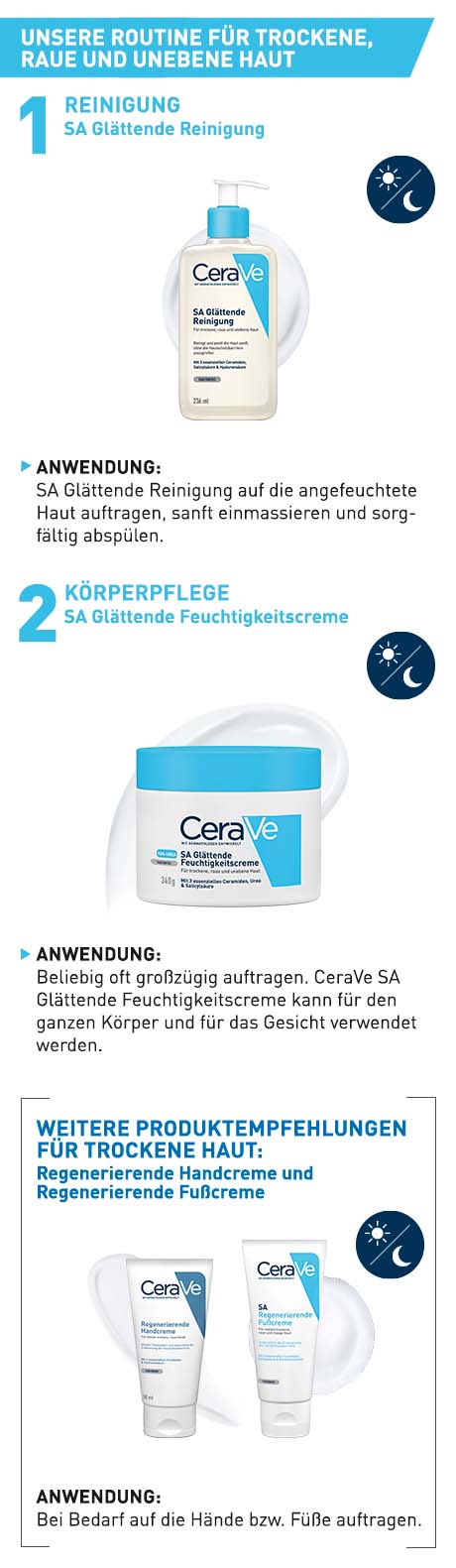 - Da die CeraVe SA Urea Glättende Feuchtigkeitscreme keine Duftstoffe enthält, eignet sie sich auch bei empfindlicher Haut und bei Reibeisenhaut.