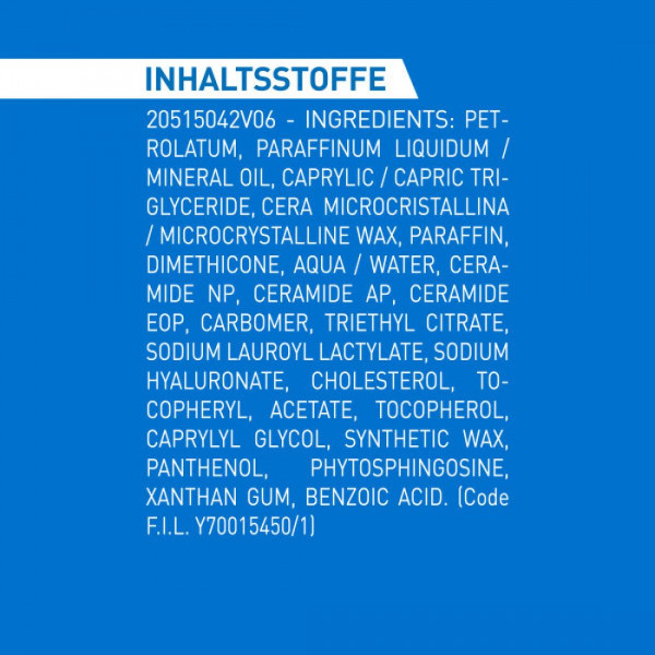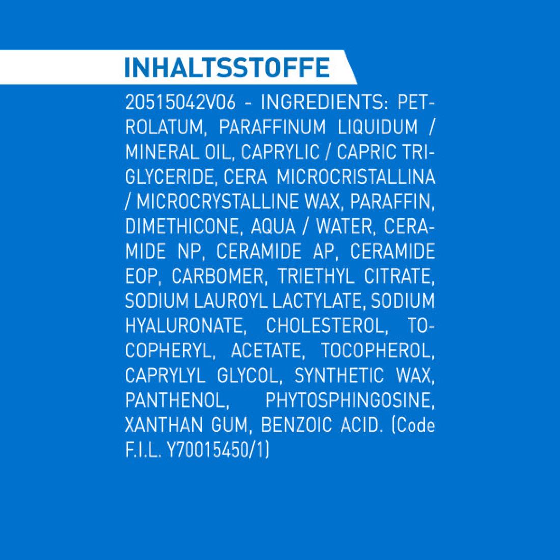 PETROLATUM • PARAFFINUM LIQUIDUM / MINERAL OIL • CERA MICROCRISTALLINA / MICROCRYSTALLINE WAX • PARAFFIN • CAPRYLIC/CAPRIC TRIGLYCERIDE • DIMETHICONE • AQUA / WATER • CERAMIDE NP • CERAMIDE AP • CERAMIDE EOP • CARBOMER • TRIETHYL CITRATE • SODIUM LAUROYL LACTYLATE • SODIUM HYALURONATE • CHOLESTEROL • TOCOPHERYL ACETATE • TOCOPHEROL • CAPRYLYL GLYCOL • SYNTHETIC WAX • PANTHENOL • PHYTOSPHINGOSINE • XANTHAN GUM • BENZOIC ACID