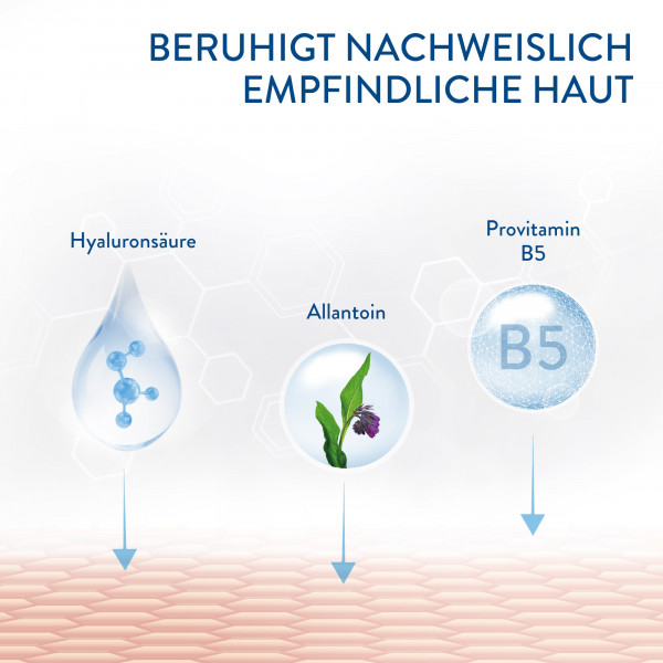 - Spendet intensiv Feuchtigkeit und beruhigt zu Rötungen neigende Haut mit Hyaluronsäure, Glycerin, Allantoin, Vitamin E, Vitamin B und Provitamin B5