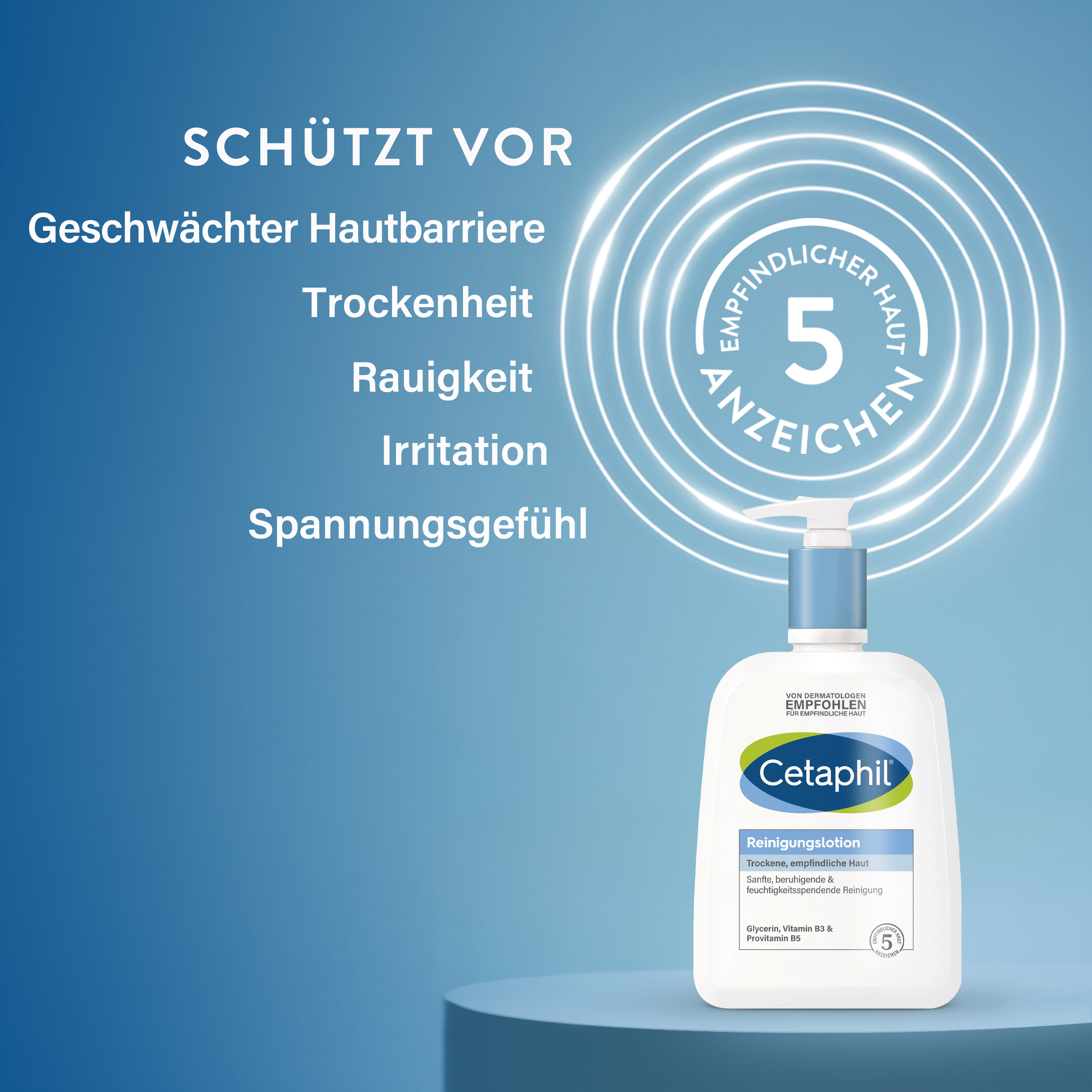 Empfindliche / trockene Haut460 ml SpenderDie seifen- und duftstofffreie Cetaphil® Reinigungslotion ist besonders für die tägliche Reinigung empfindlicher und trockener Haut geeignet. Der neutrale pH-Wert sorgt für eine schonende Anwendung. Die Haut wird sanft gereinigt und gleichzeitig beruhigt und gepflegt. Auch für die Entfernung von Make-up geeignet. Für eine zarte und geschmeidige Haut.ANWENDUNG: Cetaphil® Reinigungslotion auf die trockene oder angefeuchtete Haut auftragen und sorgfältig einmassieren. Abspülen und mit einem weichen Handtuch trocken tupfen. Bei der Make-up Entfernung können Reste auch mit einem Kosmetiktuch/ Wattepad abgenommen werden.EMPFEHLUNG: Sanfte Reinigung empfindlicher Haut sowie nach dermatologischen Behandlungen. Auch für Babyhaut geeignet.