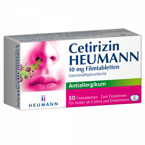 Bei Erwachsenen und Kindern ab einem Alter von 6 Jahren ist Cetirizin HEUMANN angezeigt zur: Linderung von Nasen- und Augensymptomen bei saisonaler und ganzjähriger allergischer Rhinitis; Linderung von Nesselsucht (Urtikaria). Enthält Lactose.