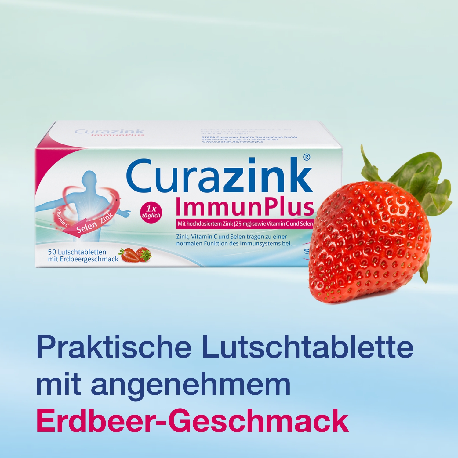 Die essenziellen Spurenelemente Zink, Selen und Vitamin C spielen unter anderem für die normale Funktion des Immunsystems eine wichtige Rolle. Curazink® ImmunPlus kombiniert in einer leicht einzunehmenden, fruchtig-frisch schmeckenden Lutschtablette hochdosiertes Zink (25 mg) mit Selen und der empfohlenen Tagesdosierung an Vitamin C. So leistet Curazink® ImmunPlus einen wertvollen Beitrag zur Ergänzung Ihrer täglichen Ernährung und zur Unterstützung der normalen Funktion ihres Immunsystems.