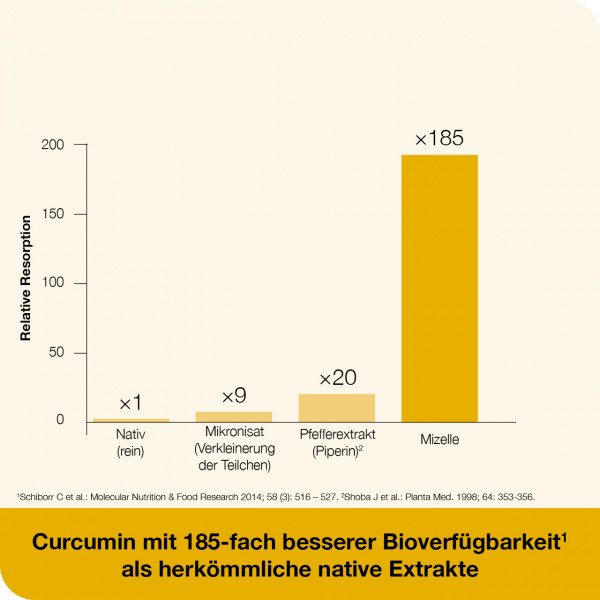 Boswelliasäuren in sogenannte Mizellen „verpackt“. Ähnliche Mizellen stellt der menschliche Körper beispielsweise auch her, um die fettlöslichen Vitamine aus der Milch aufnehmen und verwerten zu können. Dadurch werden sowohl Curcumin als auch die Boswelliasäuren besonders gut aufgenommen. Studien konnten belegen, dass die sogenannte Bioverfügbarkeit des Curcumins 185-fach höher ist als bei einem herkömmlichen Extrakt und die der Boswelliasäuren bis zu 56-fach1,8.