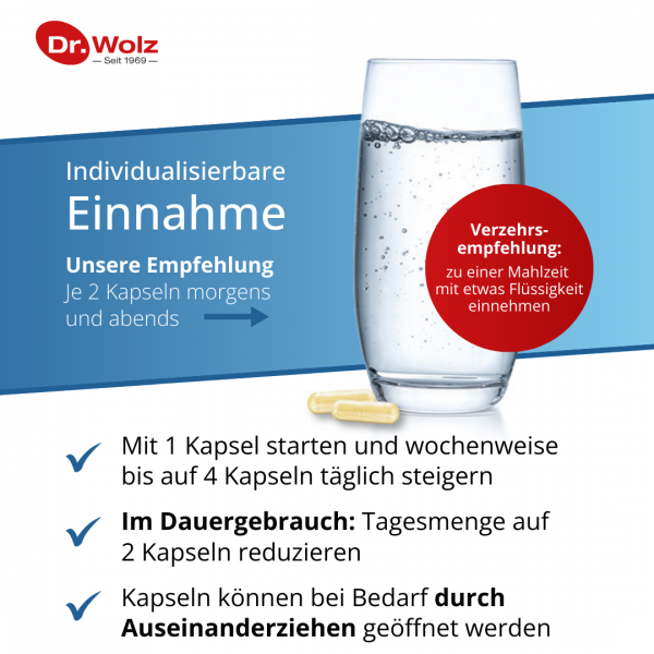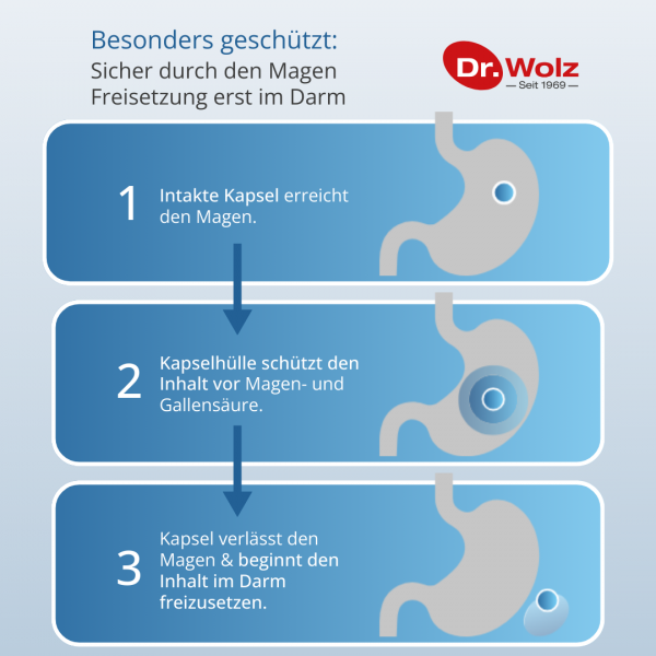 Darmflora plus select Dr.Wolz enthält 8 selektierte probiotische Kulturen in einer Konzentration von 48 Milliarden Milchsäurebakterien pro Tagesportion. Die Milchsäurebakterien sind doppelt geschützt gegen Magen- und Gallensäure. Darmflora plus select Dr.Wolz ist ein speziell für die Wiederherstellung einer gesunden Darmflora entwickeltes Präparat. Die selektierten Kulturen sind auf die unterschiedlichen Darmabschnitte des menschlichen Körpers abgestimmt.