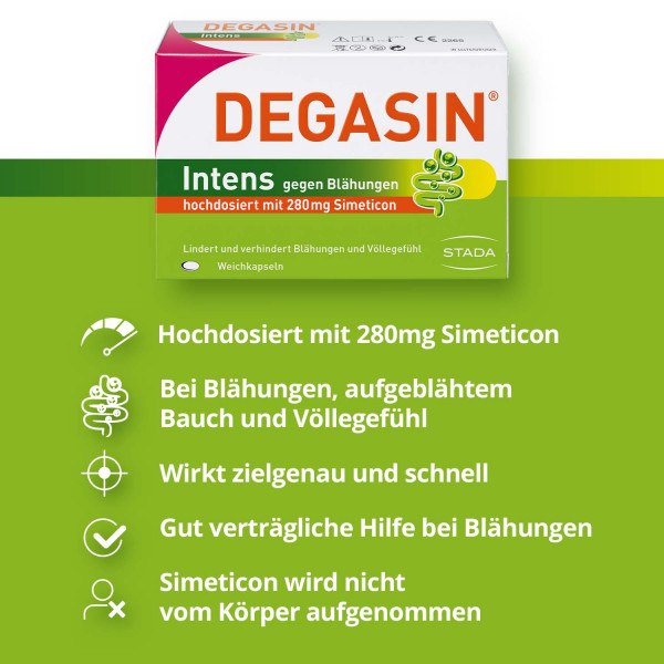 - DEGASIN® Intens ist eine gut verträgliche Hilfe bei Blähungen