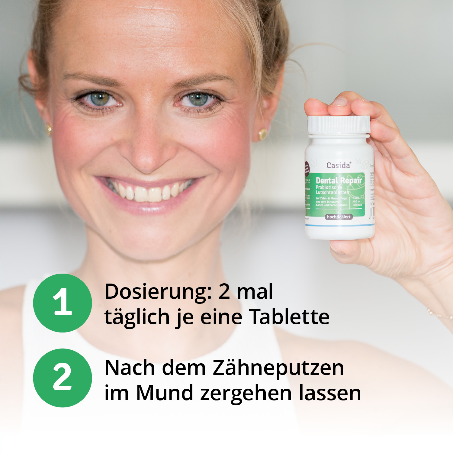 - Mit nur 2 Lutschtabletten pro Tag fördern die Dental Repair Probiotika Lutschtabletten eine ausgewogene Balance der protektiven Mundflora.