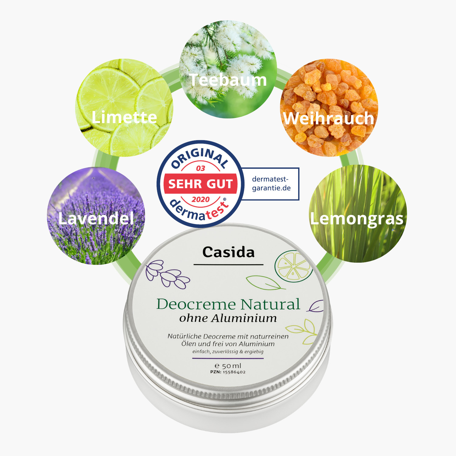 Transpiration ist ein natürlicher Vorgang. Schweiß ist bei seiner Entstehung geruchsneutral. Aufgrund der bakteriellen Zersetzung entstehen unangenehme Gerüche. Die natürliche Deocreme Natural ohne Aluminium bietet einen zuverlässigen Schutz vor Körpergeruch und pflegt sensible Haut durch natürliche Inhaltsstoffe. Das enthaltene Natriumhydrogencarbonat (Natron) und Zinkoxid wirken antibakteriell und geruchsneutralisierend. Weihrauch und Teebaumöl hemmen das Bakterienwachstum und sind entzündungshemmend. Kokosöl, Shea Butter und Weizenkeimöl pflegen die sensible Haut, so dass die Deocreme Natural auch direkt nach der Rasur angewendet werden kann. Geruchsbildung wird zuverlässig verhindert ohne die Poren zu verkleben. Die Haut kann atmen und fühlt sich gepflegt und geschmeidig an. Aufgrund ihrer hohen Ergiebigkeit ist die Deocreme ohne Aluminium der ideale Begleiter für ein frisches Haut- und Körpergefühl. Die Deocreme mit ätherischen Ölen hemmt die bakterielle Zersetzung des Körperschweißes und damit die Entstehung unangenehmen Körpergeruchs auf natürliche Art und bringt einen angenehm frischen Duft nach Zitrus für einen unbeschwerten Tag. Auf den Einsatz von Aluminiumsalzen wird konsequent verzichtet.