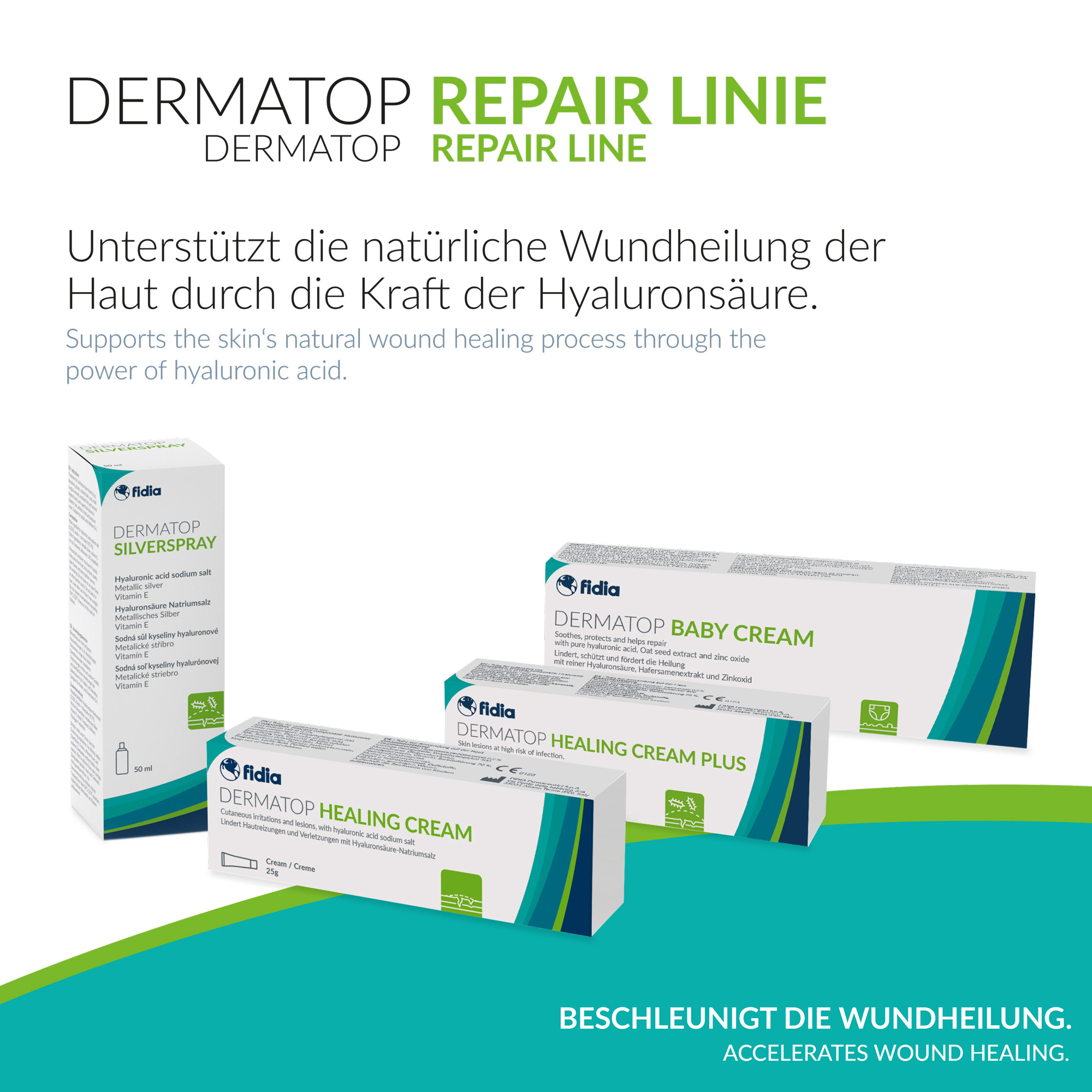 Die DERMATOP® Repair Linie bietet eine umfassende Lösung zur Behandlung von Hautverletzungen und zur Unterstützung der natürlichen Wundheilung. Mit innovativen Inhaltsstoffen wie Hyaluronsäure und metallischem Silber helfen die Produkte dabei, Hautreizungen zu lindern, die Heilung zu beschleunigen und das Risiko von Infektionen zu reduzieren. Ob bei kleineren Schnittwunden, Schürfwunden oder Verbrennungen – DERMATOP® Repair Produkte sind die richtige Wahl zur Pflege verletzter Haut.