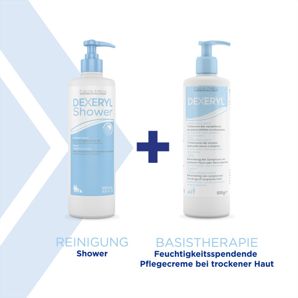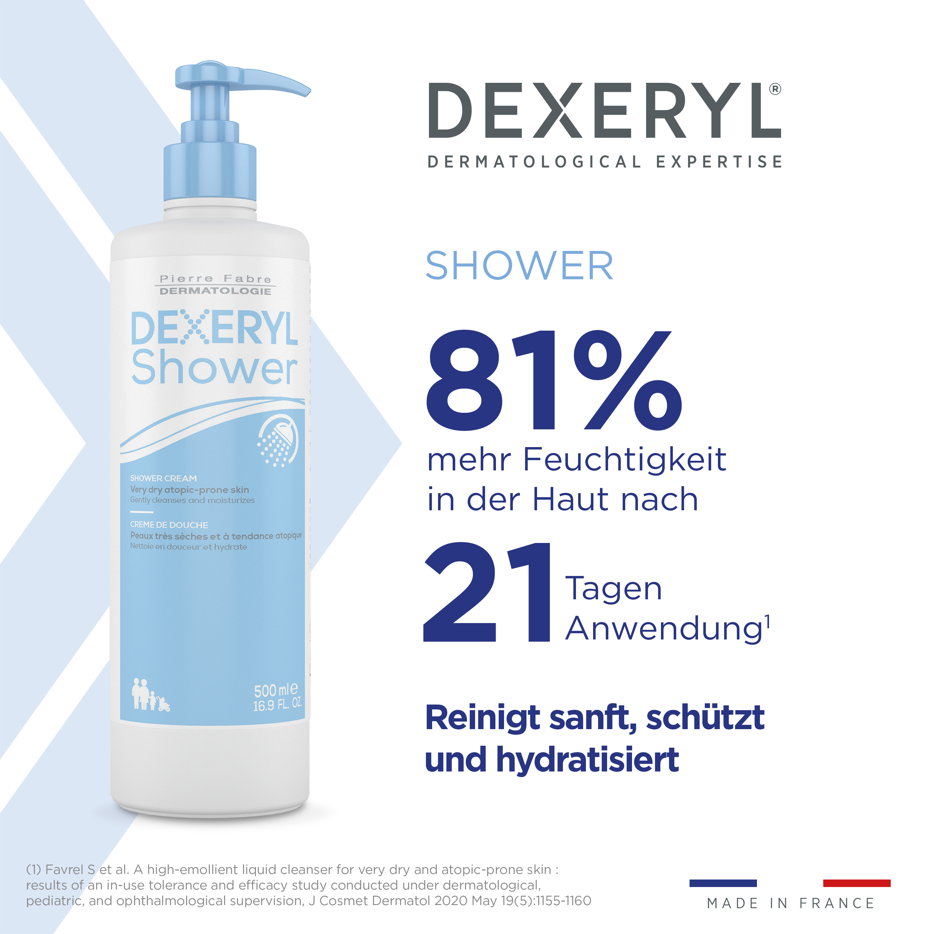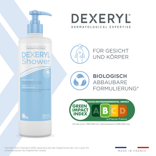 DEXERYL® Shower Duschcreme in der 500-Milliliter-Variante ist speziell für die tägliche Reinigung von trockener Haut entwickelt. Die Duschcreme bietet eine schonende Reinigung und intensive Feuchtigkeitsversorgung, um Hautirritationen und Trockenheit entgegenzuwirken. Sie ist hypoallergen sowie parfüm- und seifenfrei und eignet sich somit hervorragend für die ganze Familie, einschließlich Babys und Kinder.